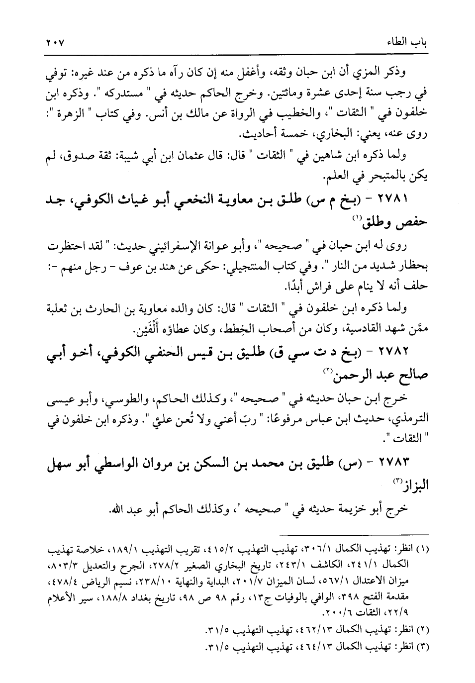 (¬١) انظر: تهذيب الكمال ١/ ٣٠٦، تهذيب التهذيب ٢/ ٤١٥، تقريب التهذيب ١/ ١٨٩، خلاصة تهذيب الكمال ١/ ٢٤١، الكاشف ١/ ٢٤٣، تاريخ البخاري الصغير ٢/ ٢٧٨، الجرح والتعديل ٣/ ٨٠٣، ميزان الاعتدال ١/ ٥٦٧، لسان الميزان ٧/ ٢٠١، البداية والنهاية ١٠/ ٢٣٨، نسيم الرياض ٤/ ٤٧٨، مقدمة الفتح ٣٩٨، الوافي بالوفيات ج ١٣، رقم ٩٨ ص ٩٨، تاريخ بغداد ٨/ ١٨٨، سير الأعلام ٩/ ٢٢، الثقات ٦/ ٢٠٠.