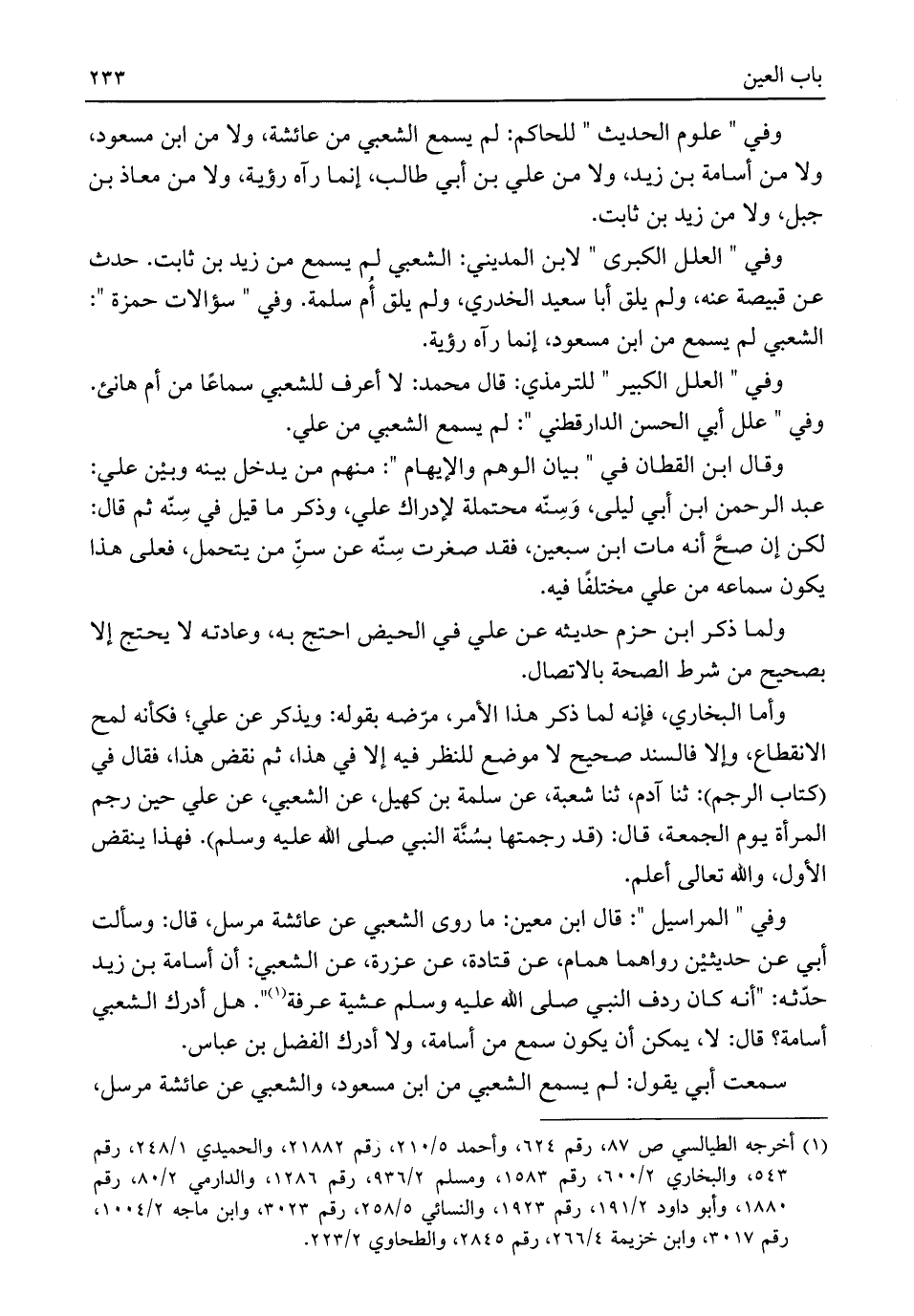 وفي "علوم الحديث" للحاكم: لم يسمع الشعبي من عائشة، ولا من ابن مسعود، ولا من أسامة بن زيد، ولا من علي بن أبي طالب، إنما رآه رؤية، ولا من معاذ بن جبل، ولا من زيد بن ثابت.