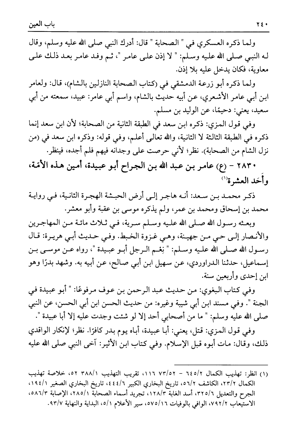 ٢٨٣٠ - (ع) عامر بن عبد اللَّه بن الجراح أبو عبيدة، أمين هذه الأمّة، وأَحَد العشرة (¬١)