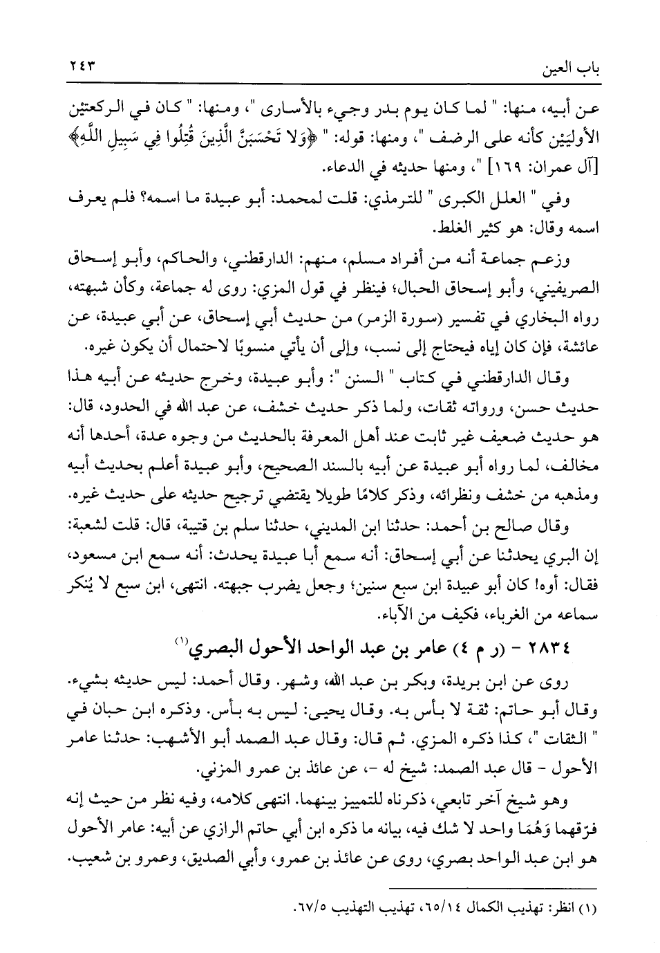 وهو شيخ آخر تابعي، ذكرناه للتمييز بينهما. انتهى كلامه، وفيه نظر من حيث إنه فرّقهما وَهُمَا واحد لا شك فيه، بيانه ما ذكره ابن أبي حاتم الرازي عن أبيه: عامر الأحول هو ابن عبد الواحد بصري، روى عن عائذ بن عمرو، وأبي الصديق، وعمرو بن شعيب.