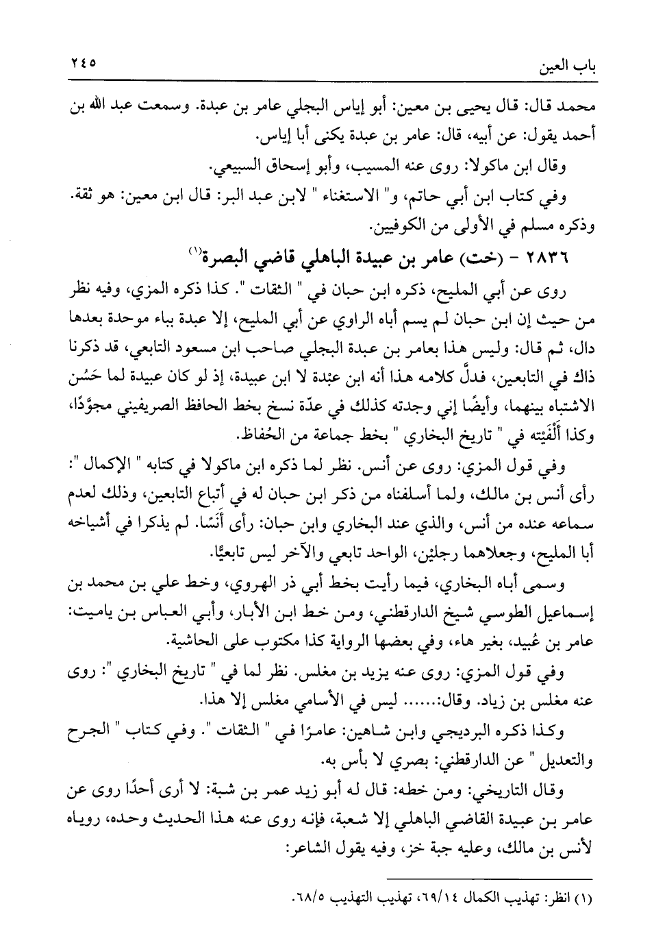 وكذا ذكره البرديجي وابن شاهين: عامرًا في "الثقات". وفي كتاب "الجرح والتعديل" عن الدارقطني: بصري لا بأس به.
