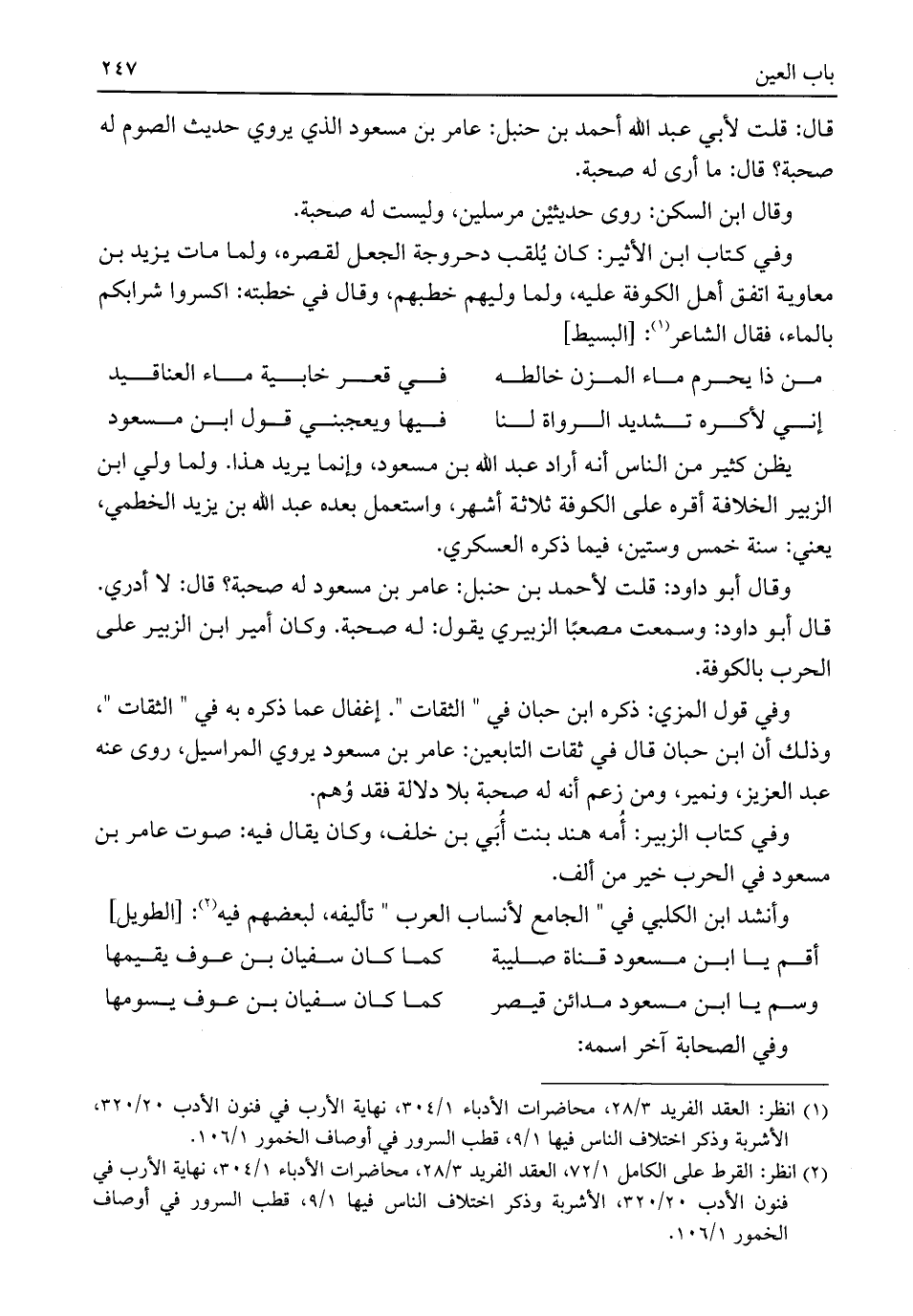 وفي قول المزي: ذكره ابن حبان في "الثقات". إغفال عما ذكره به في "الثقات"، وذلك أن ابن حبان قال في ثقات التابعين: عامر بن مسعود يروي المراسيل، روى عنه عبد العزيز، ونمير، ومن زعم أنه له صحبة بلا دلالة فقد وُهم.