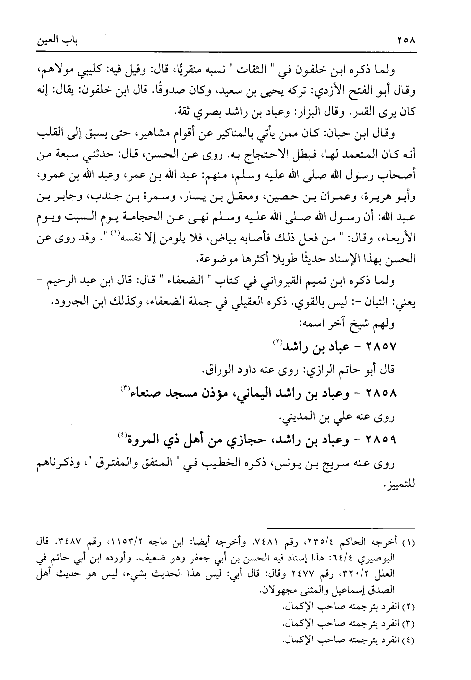 ولما ذكره ابن خلفون في "الثقات" نسبه منقريًّا، قال: وقيل فيه: كليبي مولاهم، وقال أبو الفتح الأزدي: تركه يحيى بن سعيد، وكان صدوقًا. قال ابن خلفون: يقال: إنه كان يرى القدر. وقال البزار: وعباد بن راشد بصري ثقة.