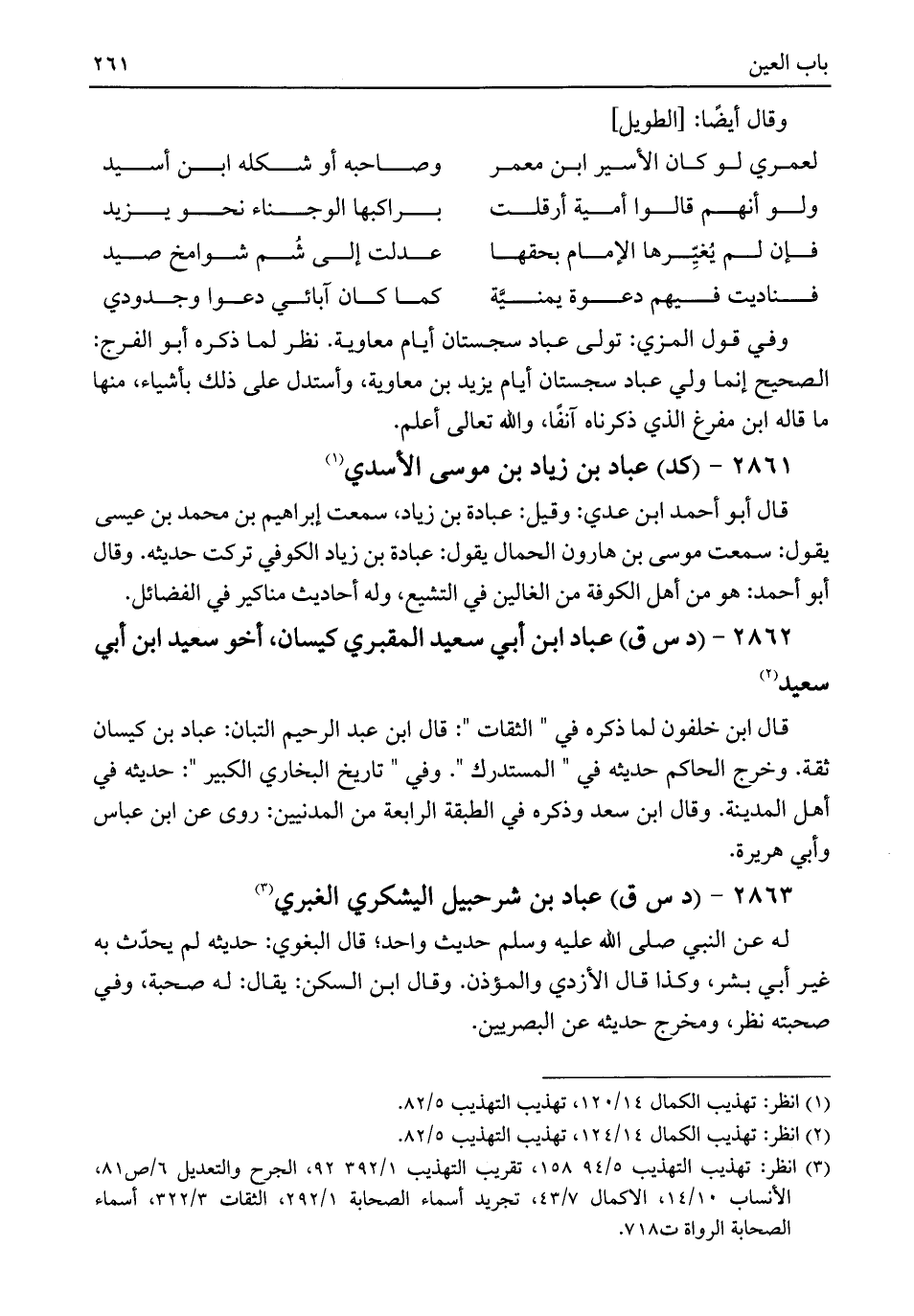 وفي قول المزي: تولى عباد سجستان أيام معاوية. نظر لما ذكره أبو الفرج: الصحيح إنما ولي عباد سجستان أيام يزيد بن معاوية، وأستدل على ذلك بأشياء، منها ما قاله ابن مفرغ الذي ذكرناه آنفًا، واللَّه تعالى أعلم.