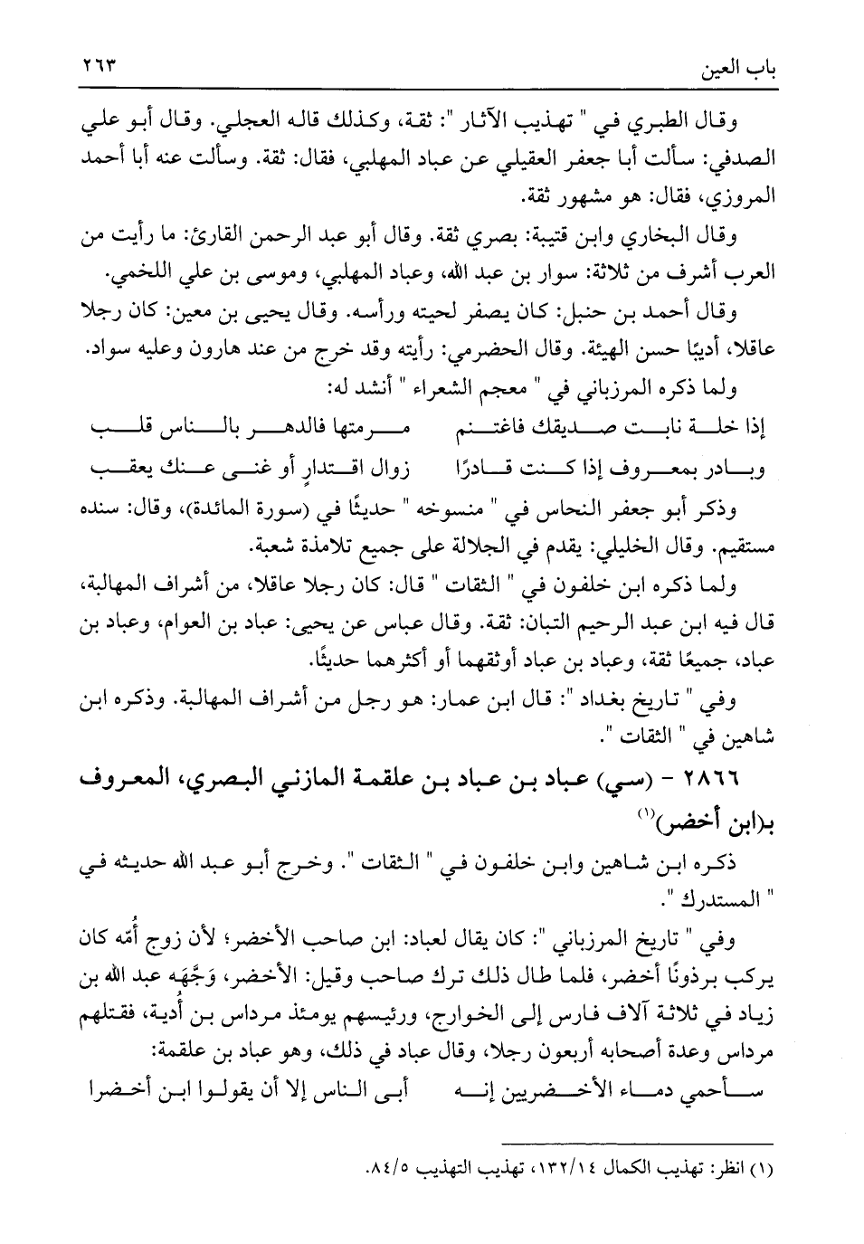 ولما ذكره ابن خلفون في "الثقات" قال: كان رجلا عاقلا، من أشراف المهالبة، قال فيه ابن عبد الرحيم التبان: ثقة. وقال عباس عن يحيى: عباد بن العوام، وعباد بن عباد، جميعًا ثقة، وعباد بن عباد أوثقهما أو أكثرهما حديثًا.