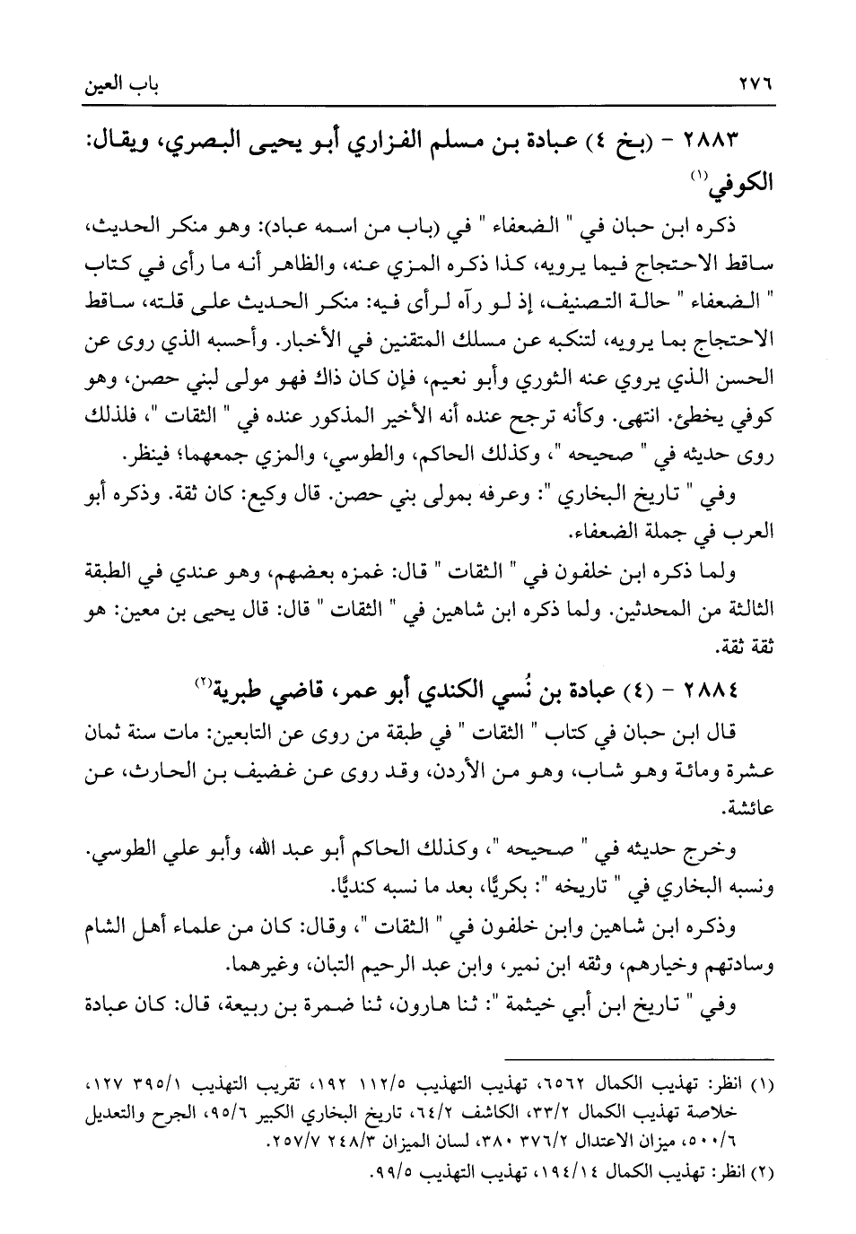 ذكره ابن حبان في "الضعفاء" في (باب من اسمه عباد): وهو منكر الحديث، ساقط الاحتجاج فيما يرويه، كذا ذكره المزي عنه، والظاهر أنه ما رأى في كتاب "الضعفاء" حالة التصنيف، إذ لو رآه لرأى فيه: منكر الحديث على قلته، ساقط الاحتجاج بما يرويه، لتنكبه عن مسلك المتقنين في الأخبار. وأحسبه الذي روى عن الحسن الذي يروي عنه الثوري وأبو نعيم، فإن كان ذاك فهو مولى لبني حصن، وهو كوفي يخطئ. انتهى. وكأنه ترجح عنده أنه الأخير المذكور عنده في "الثقات"، فلذلك روى حديثه في "صحيحه"، وكذلك الحاكم، والطوسي، والمزي جمعهما؛ فينظر.