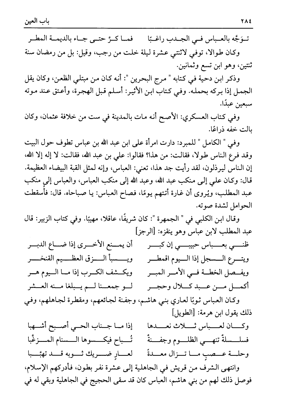وكان العباس ثوبًا لعاري بني هاشم، وجفنة لجائعهم، ومقطرة لجاهلهم، وفي ذلك يقول ابن هرمة: [الطويل]