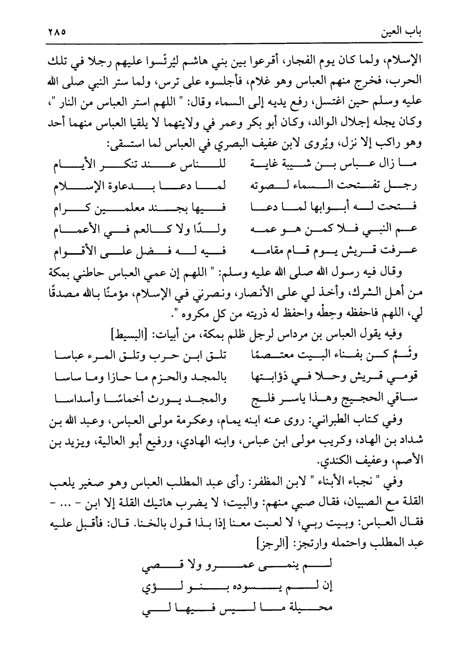 وفي "نجباء الأبناء" لابن المظفر: رأى عبد المطلب العباس وهو صغير يلعب القلة مع الصبيان، فقال صبي منهم: والبيت؛ لا يضرب هاتيك القلة إلا ابن -. . . - فقال العباس: وبيت ربي؛ لا لعبت معنا إذا بذا قول بالخنا. قال: فأقبل عليه عبد المطلب واحتمله وارتجز: [الرجز]