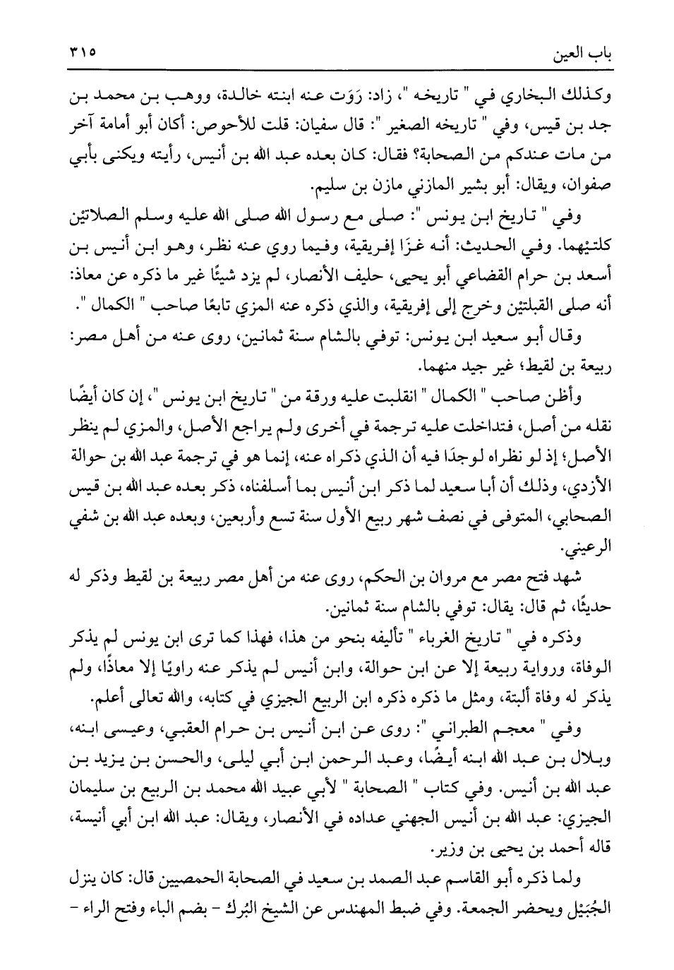 وأظن صاحب "الكمال" انقلبت عليه ورقة من "تاريخ ابن يونس"، إن كان أيضًا نقله من أصل، فتداخلت عليه ترجمة في أخرى ولم يراجع الأصل، والمزي لم ينظر الأصل؛ إذ لو نظراه لوجدَا فيه أن الذي ذكراه عنه، إنما هو في ترجمة عبد اللَّه بن حوالة الأزدي، وذلك أن أبا سعيد لما ذكر ابن أنيس بما أسلفناه، ذكر بعده عبد اللَّه بن قيس الصحابي، المتوفى في نصف شهر ربيع الأول سنة تسع وأربعين، وبعده عبد اللَّه بن شفي الرعيني.