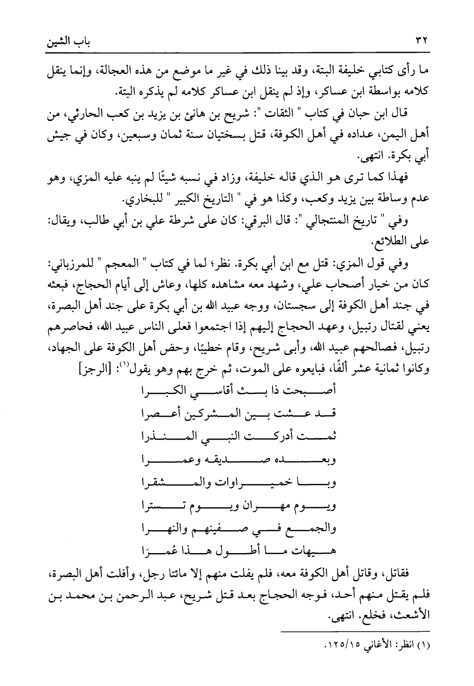 وفي قول المزي: قتل مع ابن أبي بكرة. نظر؛ لما في كتاب "المعجم" للمرزباني: كان من خيار أصحاب علي، وشهد معه مشاهده كلها، وعاش إلى أيام الحجاج، فبعثه في جند أهل الكوفة إلى سجستان، ووجه عبيد اللَّه بن أبي بكرة على جند أهل البصرة، يعني لقتال رتبيل، وعهد الحجاج إليهم إذا اجتمعوا فعلى الناس عبيد اللَّه، فحاصرهم رتبيل، فصالحهم عبيد اللَّه، وأبى شريح، وقام خطيبًا، وحض أهل الكوفة على الجهاد، وكانوا ثمانية عشر ألفًا، فبايعوه على الموت، ثم خرج بهم وهو يقول (¬١): [الرجز]