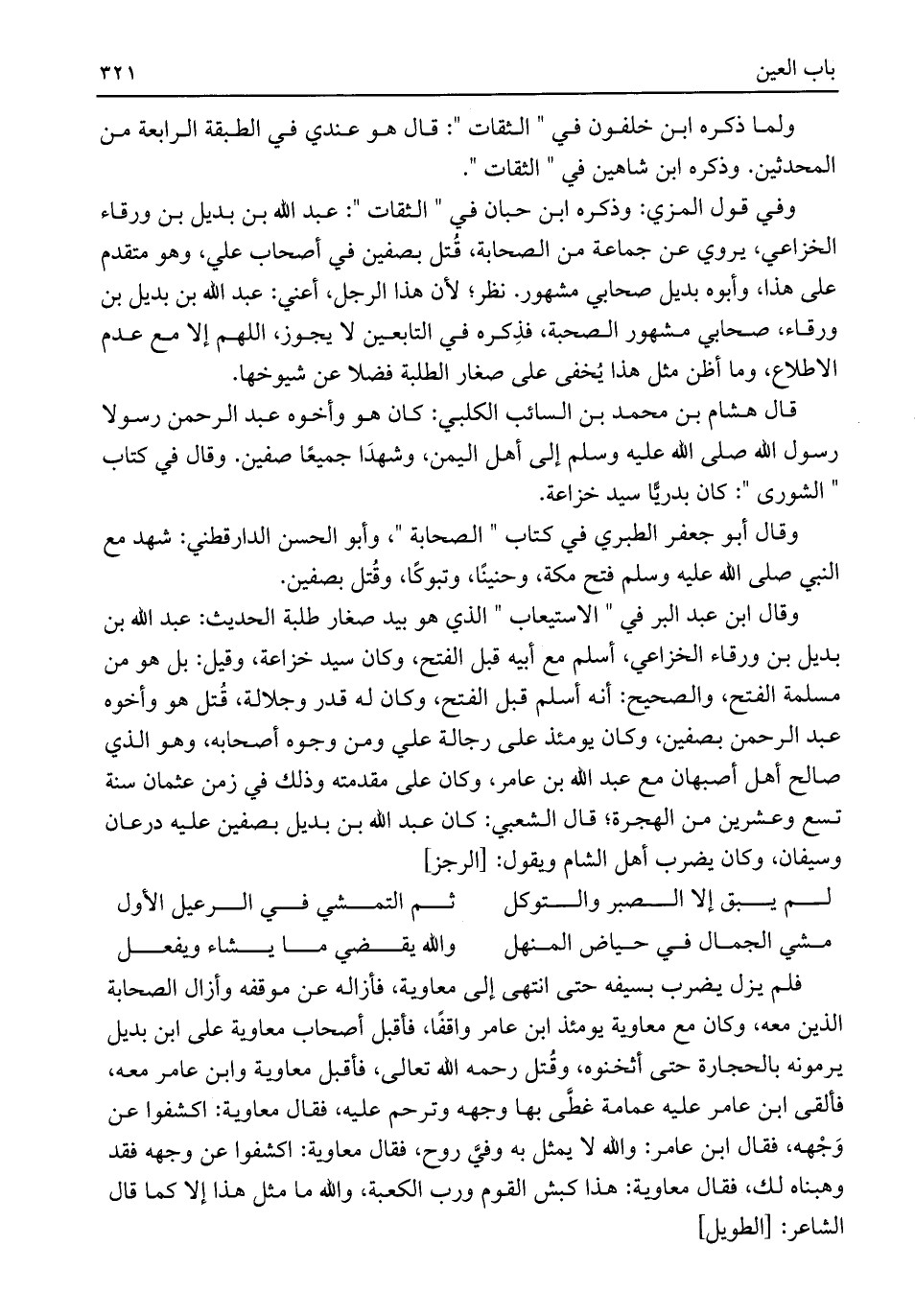 وقال ابن عبد البر في "الاستيعاب" الذي هو بيد صغار طلبة الحديث: عبد اللَّه بن بديل بن ورقاء الخزاعي، أسلم مع أبيه قبل الفتح، وكان سيد خزاعة، وقيل: بل هو من مسلمة الفتح، والصحيح: أنه أسلم قبل الفثح، وكان له قدر وجلالة، قُتل هو وأخوه عبد الرحمن بصفين، وكان يومئذ على رجالة علي ومن وجوه أصحابه، وهو الذي صالح أهل أصبهان مع عبد اللَّه بن عامر، وكان على مقدمته وذلك في زمن عثمان سنة تسع وعشرين من الهجرة؛ قال الشعبي: كان عبد اللَّه بن بديل بصفين عليه درعان وسيفان، وكان يضرب أهل الشام ويقول: [الرجز]