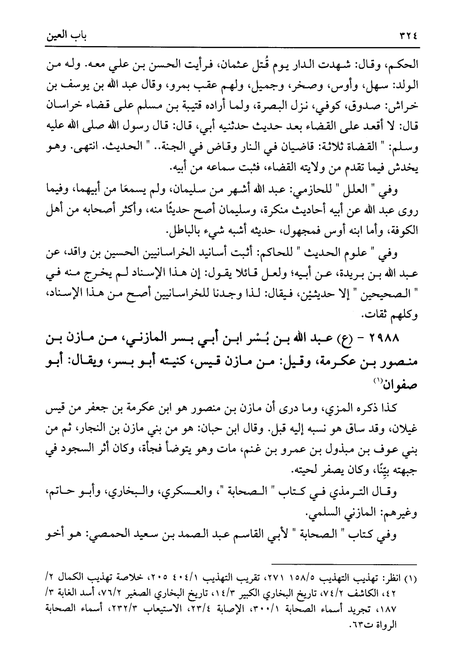 ٢٩٨٨ - (ع) عبد اللَّه بن بُسْر ابن أبي بسر المازني، من مازن بن منصور بن عكرمة، وقيل: من مازن قيس، كنيته أبو بسر، ويقال: أبو صفوان (¬١)