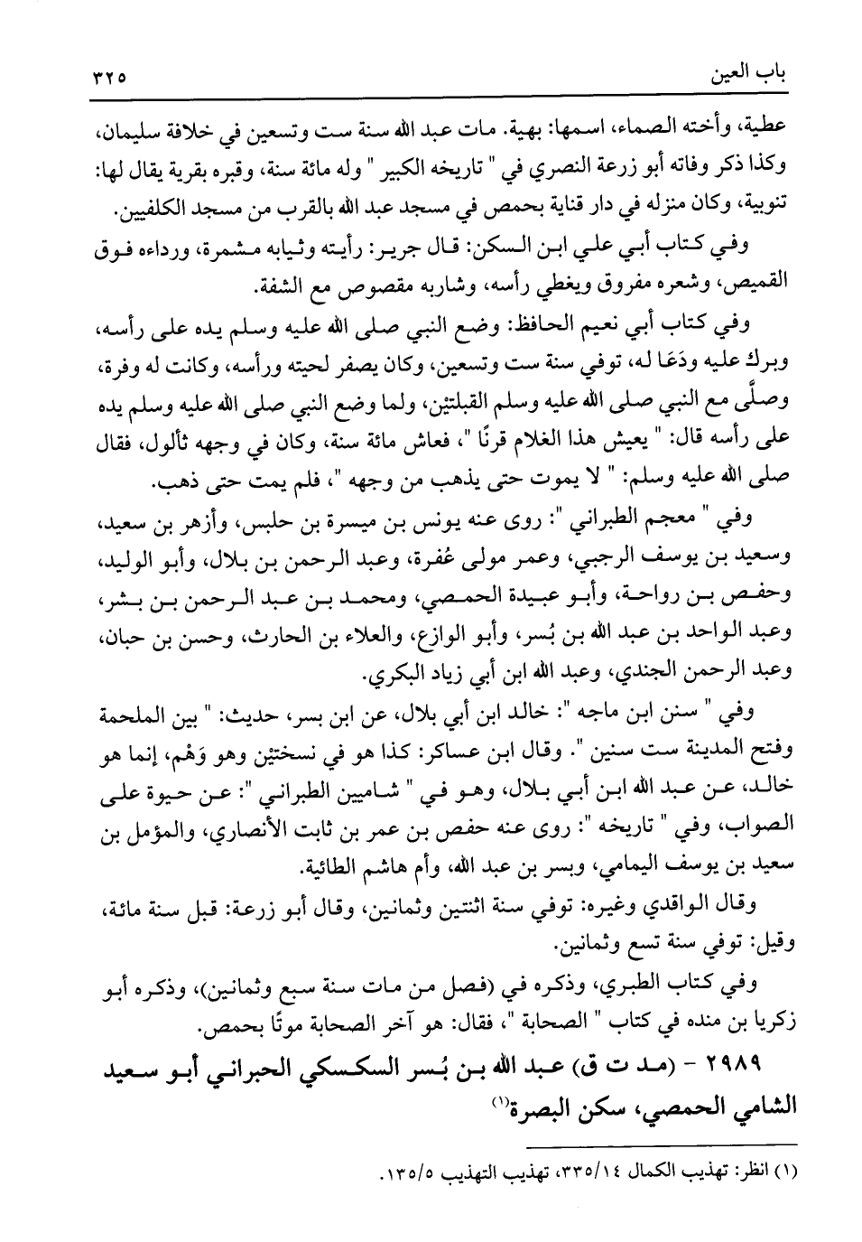 وفي كتاب الطبري، وذكره في (فصل من مات سنة سبع وثمانين)، وذكره أبو زكريا بن منده في كتاب "الصحابة"، فقال: هو آخر الصحابة موتًا بحمص.