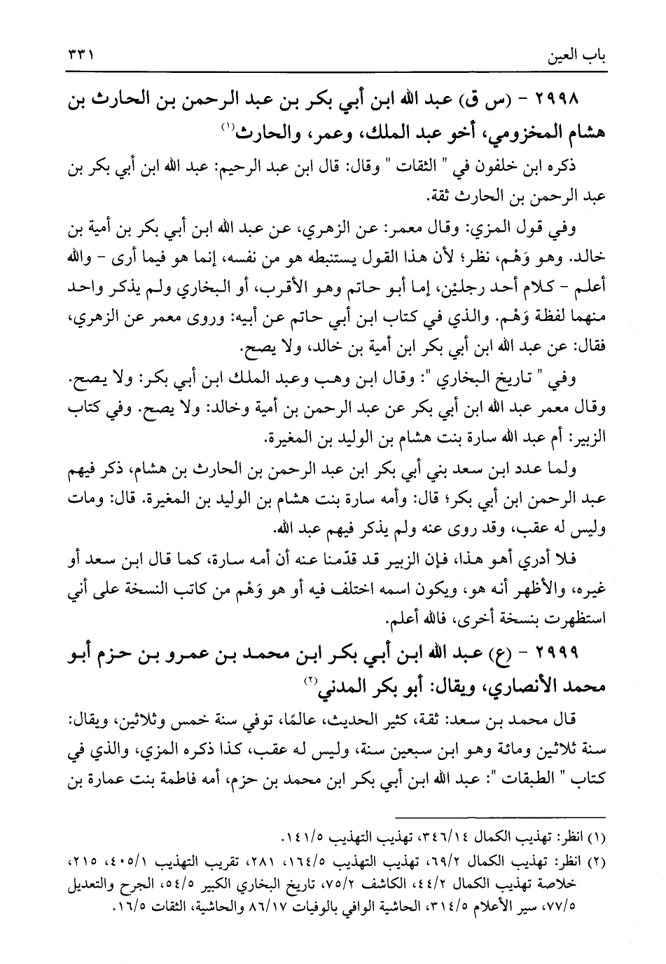 ٢٩٩٩ - (ع) عبد اللَّه ابن أبي بكر ابن محمد بن عمرو بن حزم أبو محمد الأنصاري، ويقال: أبو بكر المدني (¬٢)