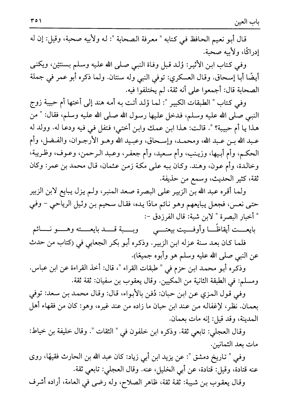 وفي كتاب ابن الأثير: وُلد قبل وفاة النبي صلى اللَّه عليه وسلم بسنتيْن، ويكنى أيضًا أبا إسحاق. وقال العسكري: توفي النبي وله سنتان. ولما ذكره أبو عمر في جملة الصحابة قال: أجمعوا على أنه ثقة، لم يختلفوا فيه.