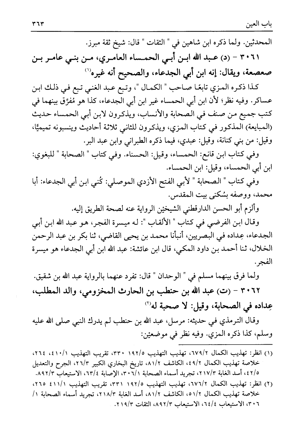 ٣٠٦١ - (د) عبد اللَّه ابن أبي الحمساء العامري، من بني عامر بن صعصعة، ويقال: إنه ابن أبي الجدعاء، والصحيح أنه غيره (¬١)