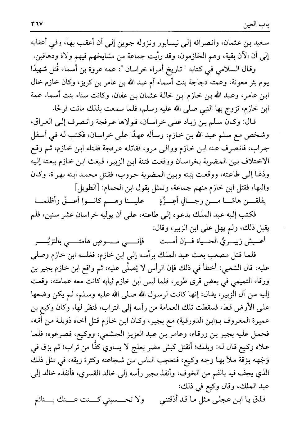 سعيد بن عثمان، وانصرافه إلى نيسابور ونزوله جوين إلى أن أعقب بها، وفي أعقابه إلى أن الآن بقية، وهم الخازمون، وقد رأيت جماعة من مشايخهم فيهم ولاة ودهاقين.