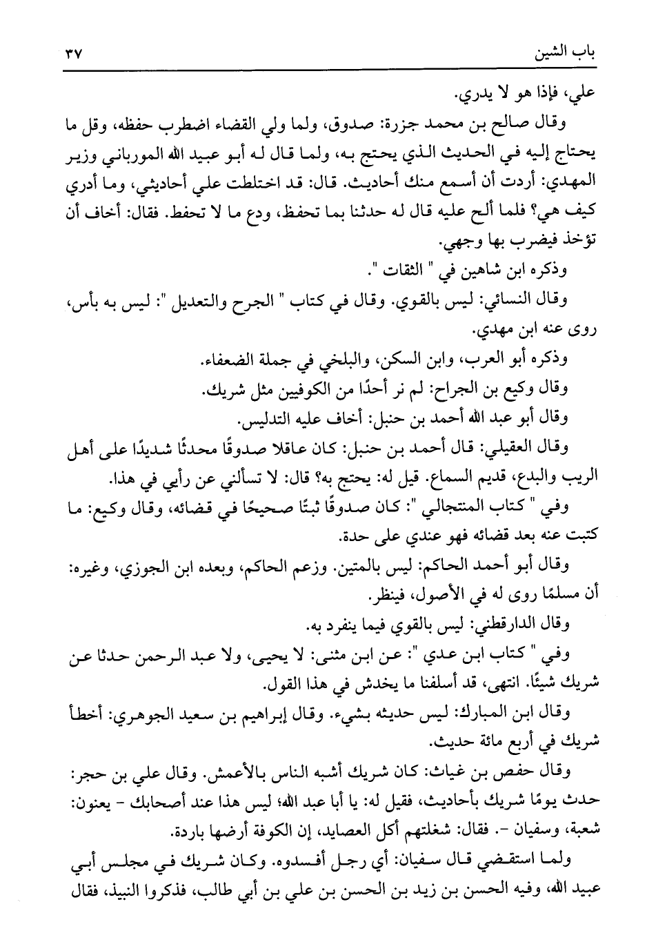 وقال ابن المبارك: ليس حديثه بشيء. وقال إبراهيم بن سعيد الجوهري: أخطأ شريك في أربع مائة حديث.