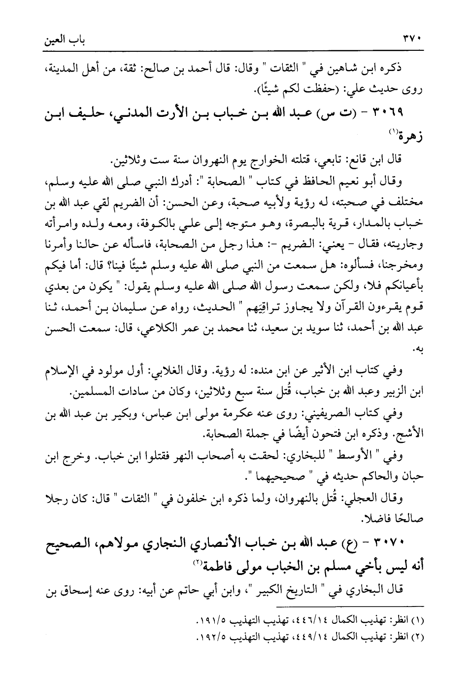 ٣٠٧٠ - (ع) عبد اللَّه بن خباب الأنصاري النجاري مولاهم، الصحيح أنه ليس بأخي مسلم بن الخباب مولى فاطمة (¬٢)