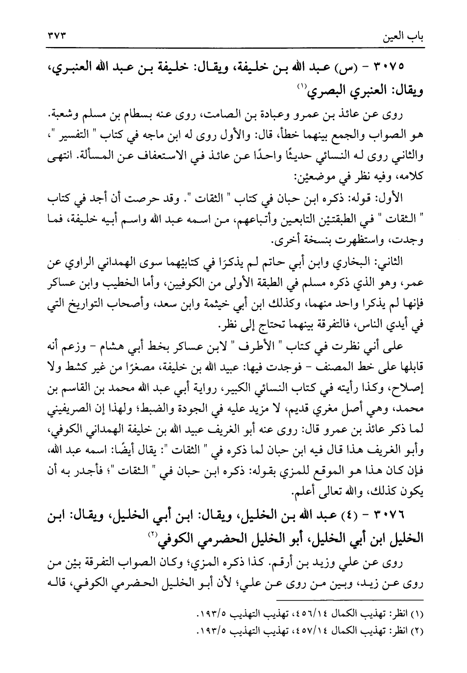الأول: قوله: ذكره ابن حبان في كتاب "الثقات". وقد حرصت أن أجد في كتاب "الثقات" في الطبقتيْن التابعين وأتباعهم، من اسمه عبد اللَّه واسم أبيه خليفة، فما وجدت، واستظهرت بنسخة أخرى.
