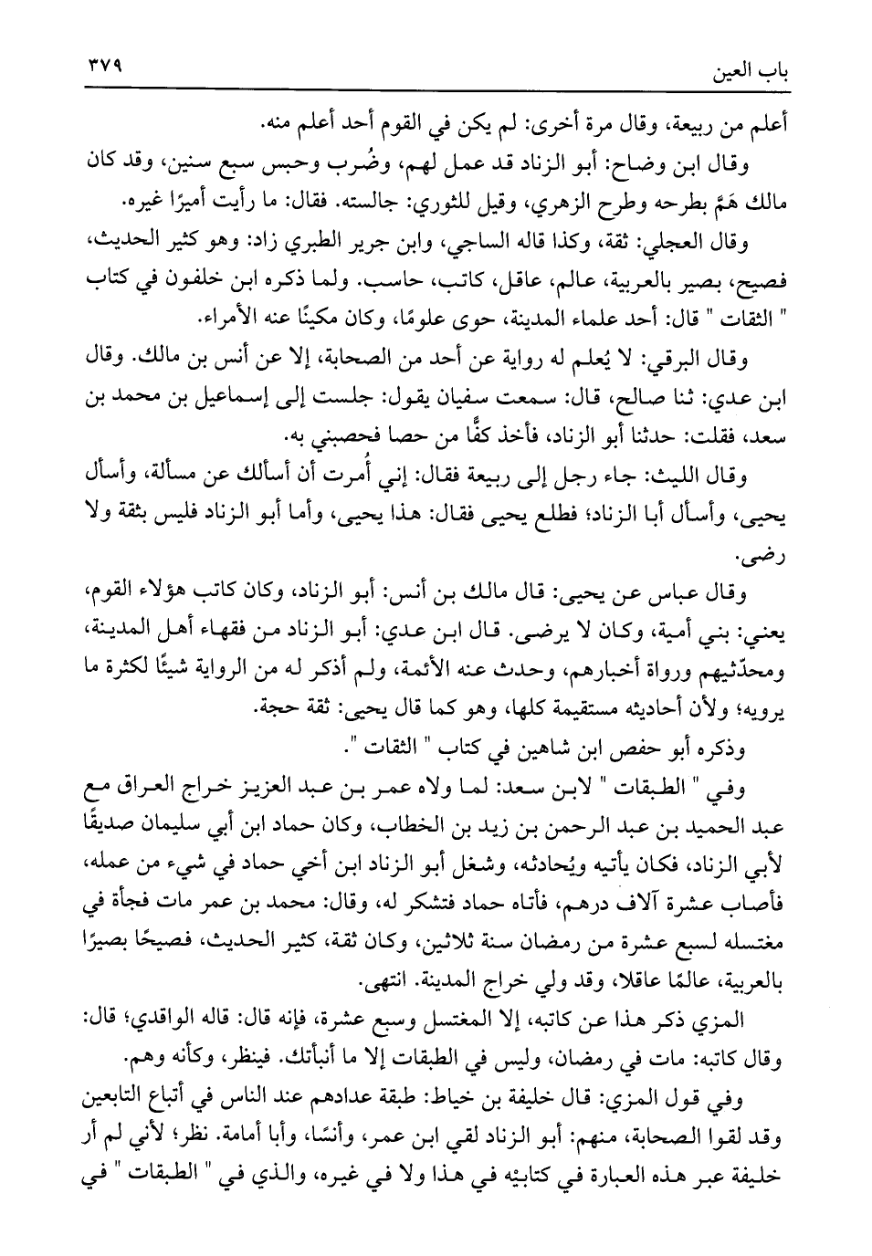 وقال عباس عن يحيى: قال مالك بن أنس: أبو الزناد، وكان كاتب هؤلاء القوم، يعني: بني أمية، وكان لا يرضى. قال ابن عدي: أبو الزناد من فقهاء أهل المدينة، ومحدّثيهم ورواة أخبارهم، وحدث عنه الأئمة، ولم أذكر له من الرواية شيئًا لكثرة ما يرويه؛ ولأن أحاديثه مستقيمة كلها، وهو كما قال يحيى: ثقة حجة.