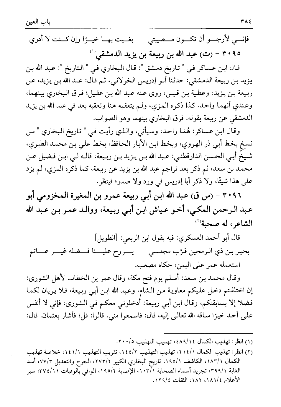 قال ابن عساكر في "تاريخ دمشق": قال البخاري في "التاريخ": عبد اللَّه بن يزيد بن ربيعة الدمشقي: حدثنا أبو إدريس الخولاني، ثم قال: عبد اللَّه بن يزيد، عن ربيعة بن يزيد، وعطية بن قيس، روى عنه عبد اللَّه بن عقيل؛ فرق البخاري بينهما، وعندي أنهما واحد. كذا ذكره المزي، ولم يتعقبه هنا وتعقبه بعد في عبد اللَّه بن يزيد الدمشقي عن ربيعة بقوله: فرق البخاري بينهما وهو الصواب.