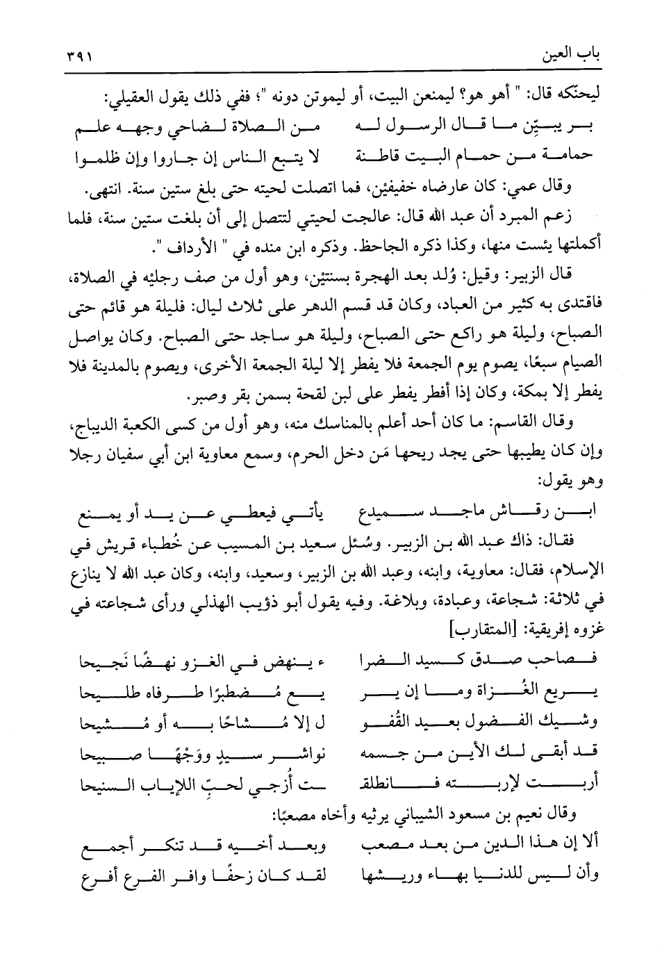فقال: ذاك عبد اللَّه بن الزبير. وسُئل سعيد بن المسيب عن خُطباء قريش في الإسلام، فقال: معاوية، وابنه، وعبد اللَّه بن الزبير، وسعيد، وابنه، وكان عبد اللَّه لا ينازع في ثلاثة: شجاعة، وعبادة، وبلاغة. وفيه يقول أبو ذؤيب الهذلي ورأى شجاعته في غزوه إفريقية: [المتقارب]