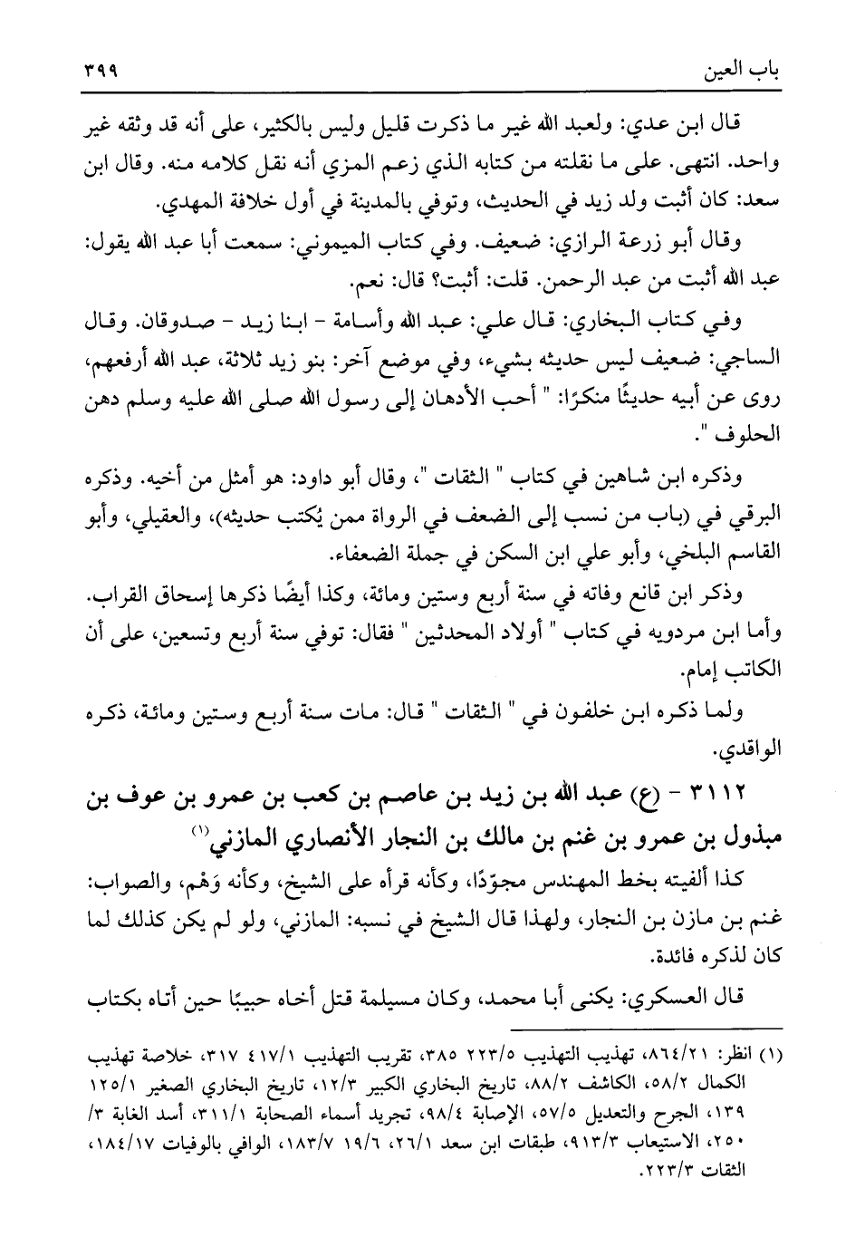 (¬١) انظر: ٢١/ ٨٦٤، تهذيب التهذيب ٥/ ٢٢٣، ٣٨٥، تقريب التهذيب ١/ ٤١٧, ٣١٧، خلاصة تهذيب الكمال ٢/ ٥٨، الكاشف ٢/ ٨٨، تاريخ البخاري الكبير ٣/ ١٢، تاريخ البخاري الصغير ١/ ١٢٥، ١٣٩، الجرح والتعديل ٥/ ٥٧، الإصابة ٤/ ٩٨، تجريد أسماء الصحابة ١/ ٣١١، أسد الغابة ٣/ ٢٥٠، الاستيعاب ٣/ ٩١٣، طبقات ابن سعد ١/ ٢٦، ٦/ ١٩, ٧/ ١٨٣، الوافي بالوفيات ١٧/ ١٨٤، الثقات ٣/ ٢٢٣.