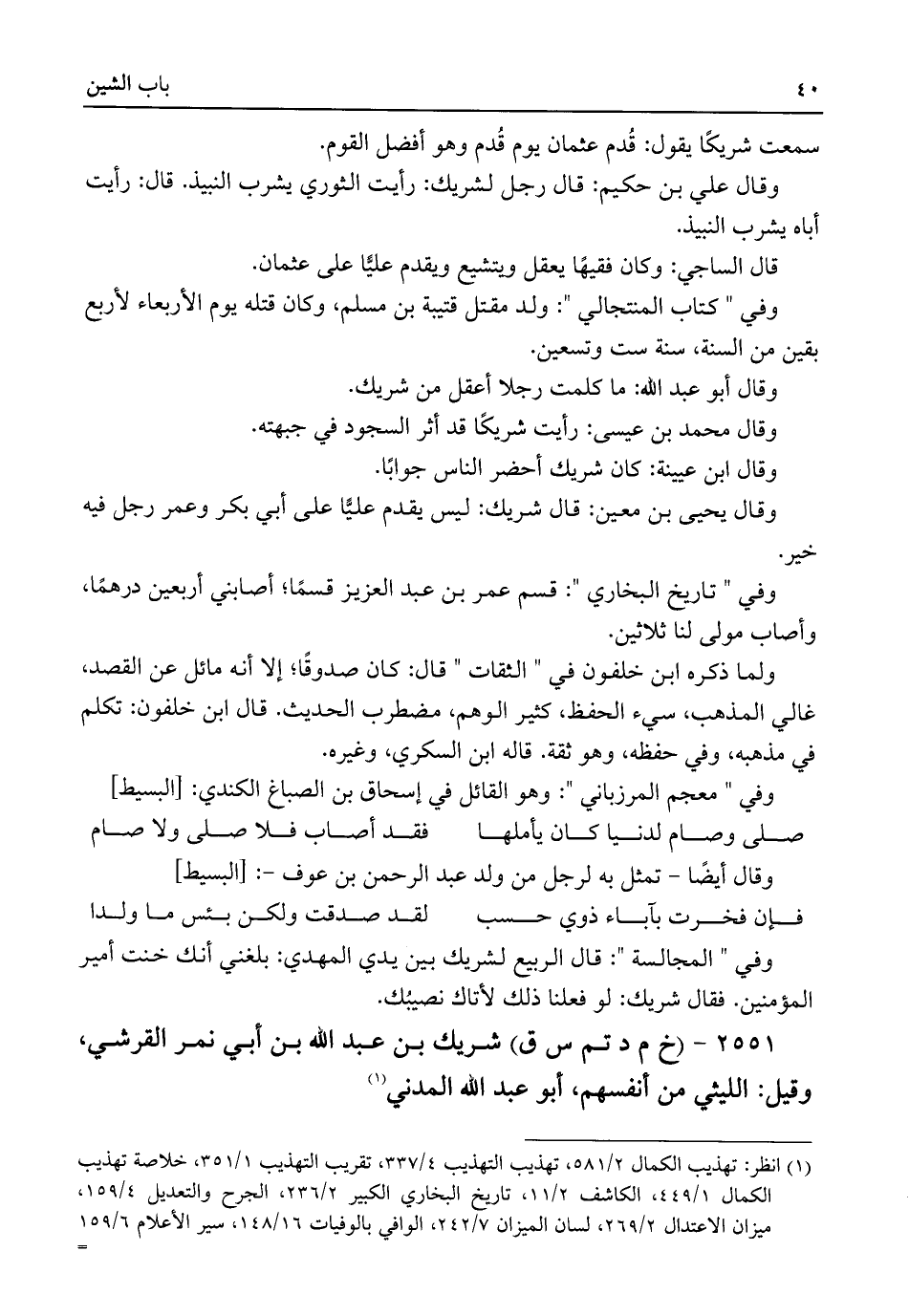 ٢٥٥١ - (خ م د تم س ق) شريك بن عبد اللَّه بن أبي نمر القرشي، وقيل: الليثي من أنفسهم، أبو عبد اللَّه المدني (¬١)