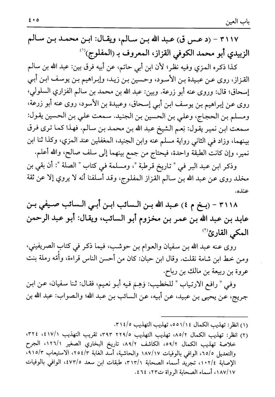٣١١٧ - (د عس ق) عبد اللَّه بن سالم، ويقال: ابن محمد بن سالم الزبيدي أبو محمد الكوفي القزاز، المعروف بـ (المفلوج) (¬١)