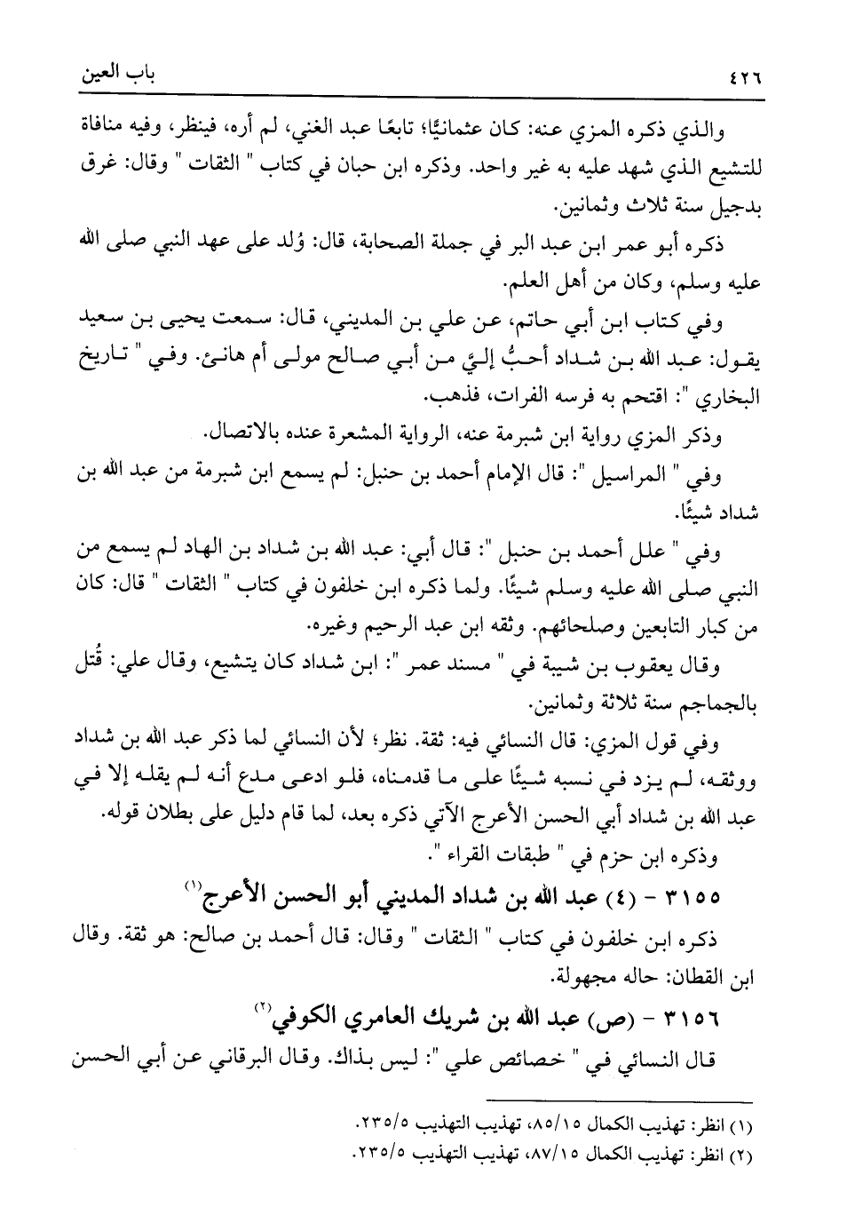 وفي قول المزي: قال النسائي فيه: ثقة. نظر؛ لأن النسائي لما ذكر عبد اللَّه بن شداد ووثقه، لم يزد في نسبه شيئًا على ما قدمناه، فلو ادعى مدع أنه لم يقله إلا في عبد اللَّه بن شداد أبي الحسن الأعرج الآتي ذكره بعد، لما قام دليل على بطلان قوله.