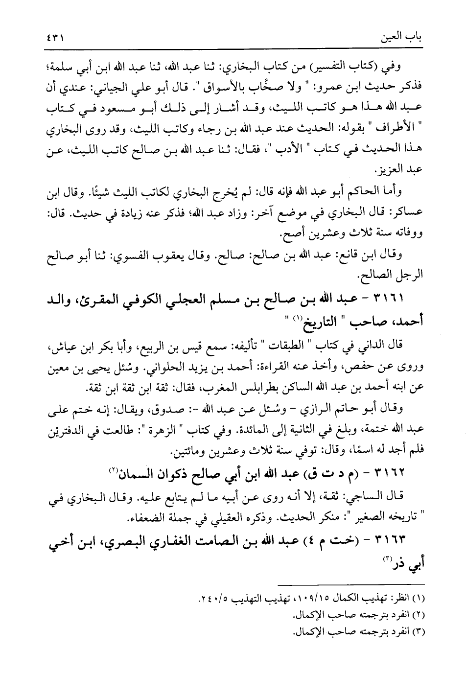 ٣١٦١ - عبد اللَّه بن صالح بن مسلم العجلي الكوفي المقرئ، والد أحمد، صاحب "التاريخ (¬١) "