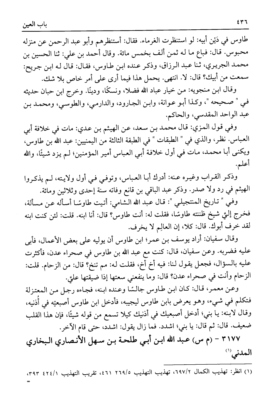 وفي قول المزي: قال محمد بن سعد، عن الهيثم بن عدي: مات في خلافة أبي العباس. نظر، والذي في "الطبقات" في الطبقة الثالثة من اليمنيين: عبد اللَّه بن طاوس، ويكنى أبا محمد، مات في أول خلافة أبي العباس أمير المؤمنين؛ لم يزد شيئًا، واللَّه أعلم.