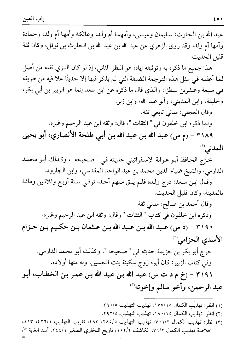 هذا جميع ما ذكره به وتوثيقه إياه، هو النظر الثاني، إذ لو كان المزي نقله من أصل لما أغفله في مثل هذه الترجمة الضيقة التي لم يذكر فيها إلا حديثًا علا فيه من طريقه في سبعة وعشرين سطرًا، والذي قال ما ذكره عن ابن سعد إنما هو الزبير بن أبي بكر، وخليفة، وابن المديني، وأبو عبد اللَّه، وابن زبر.