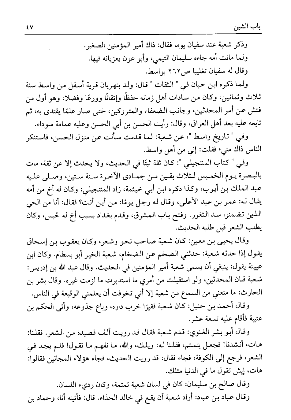 وقال يحيى بن معين: كان شعبة صاحب نحو وشعر، وكان يعقوب بن إسحاق يقول إذا حدثه شعبة: حدثني الضخم عن الضخام، شعبة الخير أبو بسطام. وكان ابن عيينة يقول: ينبغي أن يسمى شعبة أمير المؤمنين في الحديث. وقال عبد اللَّه بن إدريس: شعبة قبان المحدثين، ولو استقبلت من أمري ما استدبرت ما لزمت غيره. وقال بشر بن الحارث: ما منعني من السماع من شعبة إلا أني تخوفت أن يعلمني الوقيعة في الناس.