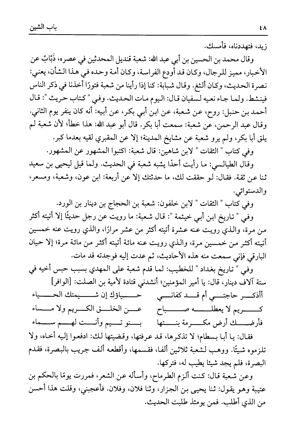 وفي "تاريخ بغداد" للخطيب: لما قدم شعبة على المهدي بسبب حبس أخيه في ستة آلاف دينار، قال: يا أمير المؤمنين، أنشدني قتادة لأمية بن الصلت: [الوافر]