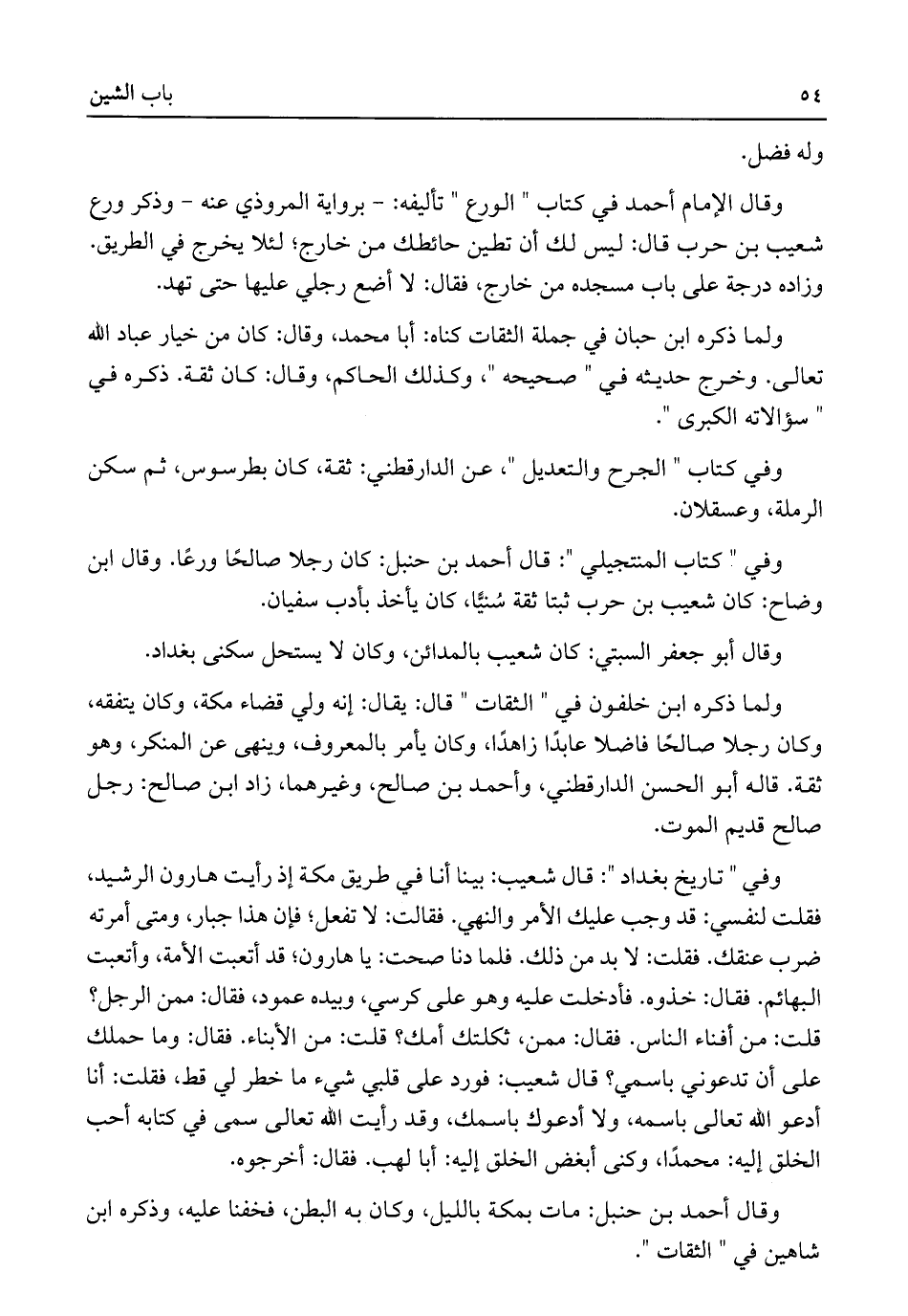 وفي "تاريخ بغداد": قال شعيب: بينا أنا في طريق مكة إذ رأيت هارون الرشيد، فقلت لنفسي: قد وجب عليك الأمر والنهي. فقالت: لا تفعل؛ فإن هذا جبار، ومتى أمرته ضرب عنقك. فقلت: لا بد من ذلك. فلما دنا صحت: يا هارون؛ قد أتعبت الأمة، وأتعبت البهائم. فقال: خذوه. فأدخلت عليه وهو على كرسي، وبيده عمود، فقال: ممن الرجل؟ قلت: من أفناء الناس. فقال: ممن، ثكلتك أمك؟ قلت: من الأبناء. فقال: وما حملك على أن تدعوني باسمي؟ قال شعيب: فورد على قلبي شيء ما خطر لي قط، فقلت: أنا أدعو اللَّه تعالى باسمه، ولا أدعوك باسمك، وقد رأيت اللَّه تعالى سمى في كتابه أحب الخلق إليه: محمدًا، وكنى أبغض الخلق إليه: أبا لهب. فقال: أخرجوه.