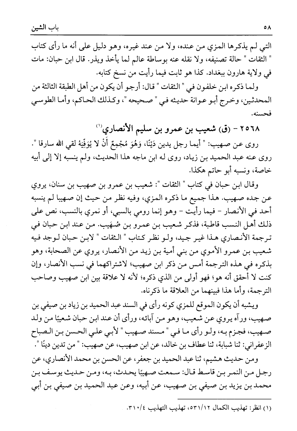 وقال ابن حبان في كتاب "الثقات": شعيب بن عمرو بن صهيب بن سنان، يروي عن جده صهيب. هذا جميع ما ذكره المزي، وفيه نظر من حيث إن صهيبا لم ينسبه أحد في الأنصار -فيما رأيت- وهو إنما رومي بالسبي، أو نمري بالنسب، نص على ذلك أهل النسب قاطبة، فذكر شعيب بن عمرو بن صُهَيب. من عند ابن حبان في ترجمة الأنصاري هذا غير جيد، ولو نظر كتاب "الثقات" لابن حبان لوجد فيه شعيب بن عمرو الأموي من بني أمية بن زيد من الأنصار، يروي عن الصحابة، وهو بذكره في هذه الترجمة أمس من ذكر ابن صهيب؛ لاشتراكهما في نسب الأنصار، وإن كنت لا أحقق أنه هو؛ فهو أولى من الذي ذكره؛ لأنه لا علاقة بين ابن صهيب وصاحب الترجمة، وأما هذا فبينهما من العلاقة ما ذكرناه.