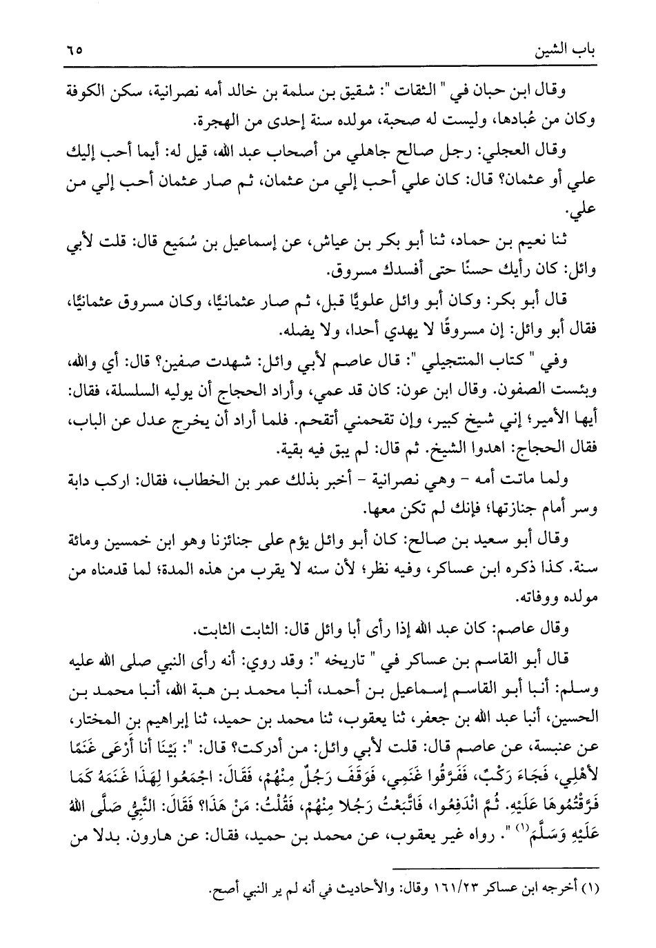وقال ابن حبان في "الثقات": شقيق بن سلمة بن خالد أمه نصرانية، سكن الكوفة وكان من عُبادها، وليست له صحبة، مولده سنة إحدى من الهجرة.