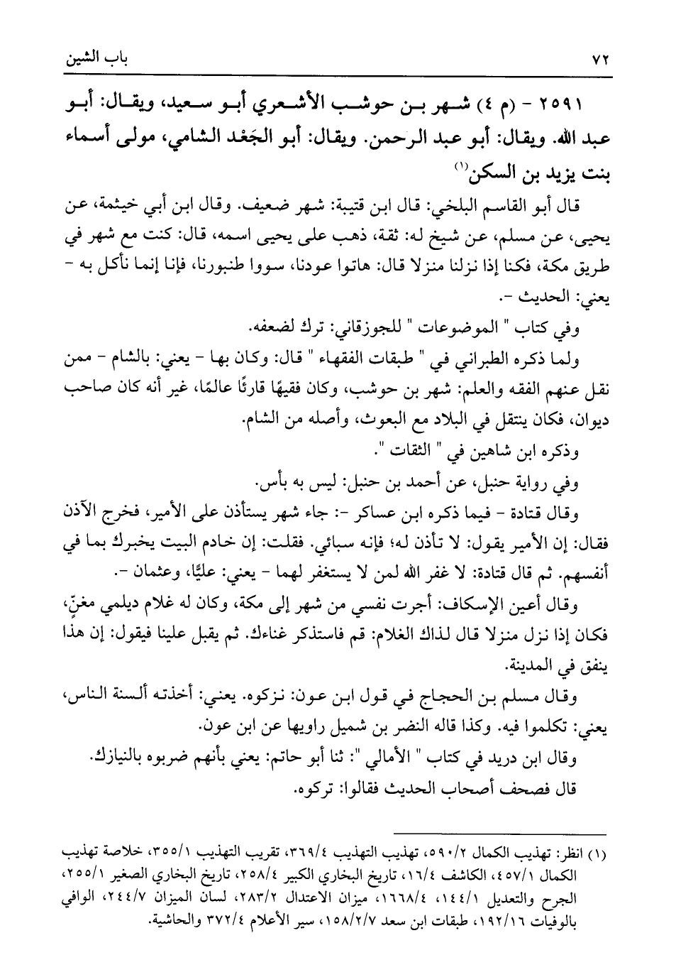 ٢٥٩١ - (م ٤) شهر بن حوشب الأشعري أبو سعيد، ويقال: أبو عبد اللَّه. ويقال: أبو عبد الرحمن. ويقال: أبو الجَعْد الشامي، مولى أسماء بنت يزيد بن السكن (¬١)