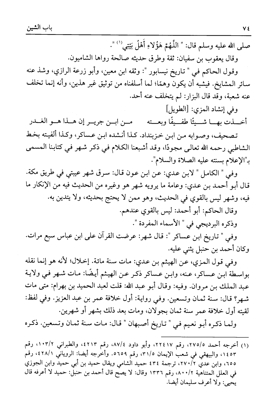 وفي "الكامل" لابن عدي: عن ابن عون قال: سرق شهر عيبتي في طريق مكة. قال أبو أحمد بن عدي: وعامة ما يرويه شهر هو وغيره من الحديث فيه من الإنكار ما فيه، وشهر ليس بالقوي في الحديث، وهو ممن لا يحتج بحديثه، ولا يتدين به.