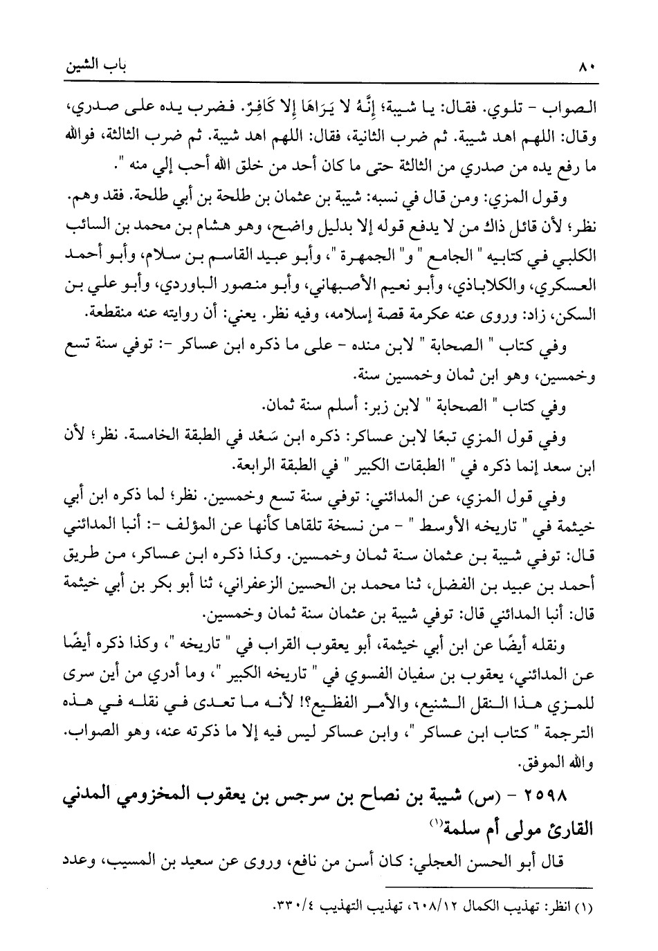 وفي قول المزي، عن المدائني: توفي سنة تسع وخمسين. نظر؛ لما ذكره ابن أبي خيثمة في "تاريخه الأوسط" -من نسخة تلقاها كأنها عن المؤلف-: أنبا المدائني قال: توفي شيبة بن عثمان سنة ثمان وخمسين. وكذا ذكره ابن عساكر، من طريق أحمد بن عبيد بن الفضل، ثنا محمد بن الحسين الزعفراني، ثنا أبو بكر بن أبي خيثمة قال: أنبا المدائني قال: توفي شيبة بن عثمان سنة ثمان وخمسين.