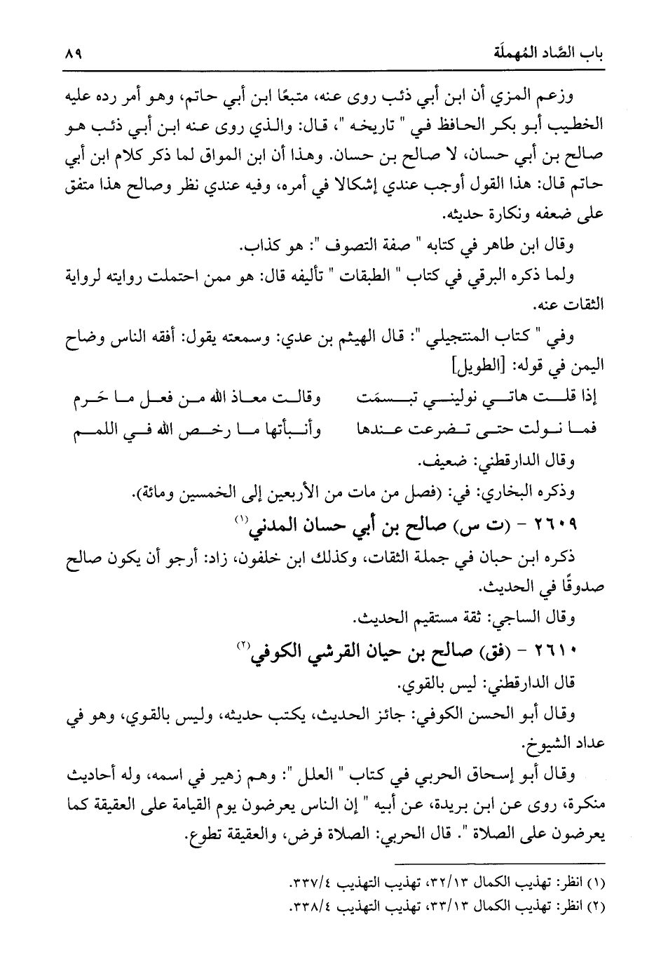 وزعم المزي أن ابن أبي ذئب روى عنه، متبعًا ابن أبي حاتم، وهو أمر رده عليه الخطيب أبو بكر الحافظ في "تاريخه"، قال: والذي روى عنه ابن أبي ذئب هو صالح بن أبي حسان، لا صالح بن حسان. وهذا أن ابن المواق لما ذكر كلام ابن أبي حاتم قال: هذا القول أوجب عندي إشكالا في أمره، وفيه عندي نظر وصالح هذا متفق على ضعفه ونكارة حديثه.