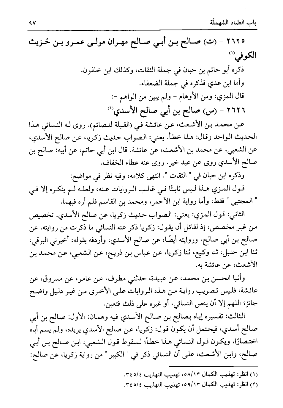 الثالث: تفسيره إياه بصالح بن صالح الأسدي فيه وهمان: الأول: صالح بن أبي صالح أسدي، فيحتمل أن يكون قول: زكريا، عن صالح الأسدي يريده، ولم يسم أباه اختصارًا، ويكون قول النسائي هذا خطأ؛ لسقوط قول الشعبي: ابن صالح بن أبي صالح، وابن الأشعث، على أن النسائي ذكر في "الكبير" من رواية زكريا، عن صالح: