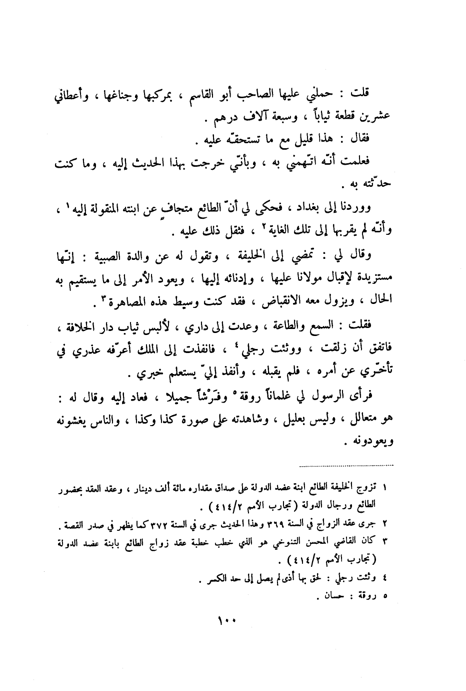 قلت: حملني عليها الصاحب أبو القاسم، بمركبها وجناغها، وأعطاني عشرين قطعة ثيابا، وسبعة آلاف درهم.