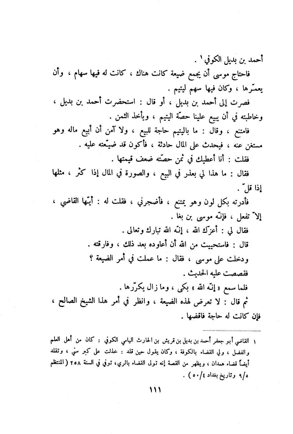 فصرت إلى أحمد بن بديل، أو قال: استحضرت أحمد بن بديل، وخاطبته في أن يبيع علينا حصّة اليتيم، ويأخذ الثمن.