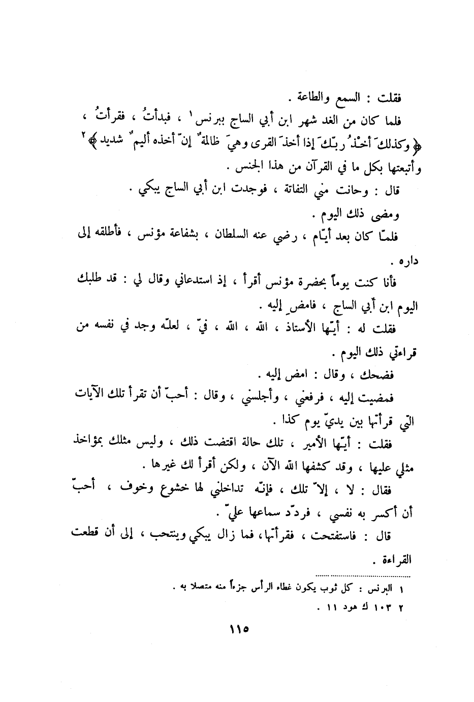 فلما كان من الغد شهر ابن أبي الساج ببرنس «1» ، فبدأت، فقرأت، وَكَذلِكَ أَخْذُ رَبِّكَ إِذا أَخَذَ الْقُرى وَهِيَ ظالِمَةٌ إِنَّ أَخْذَهُ أَلِيمٌ شَدِيدٌ