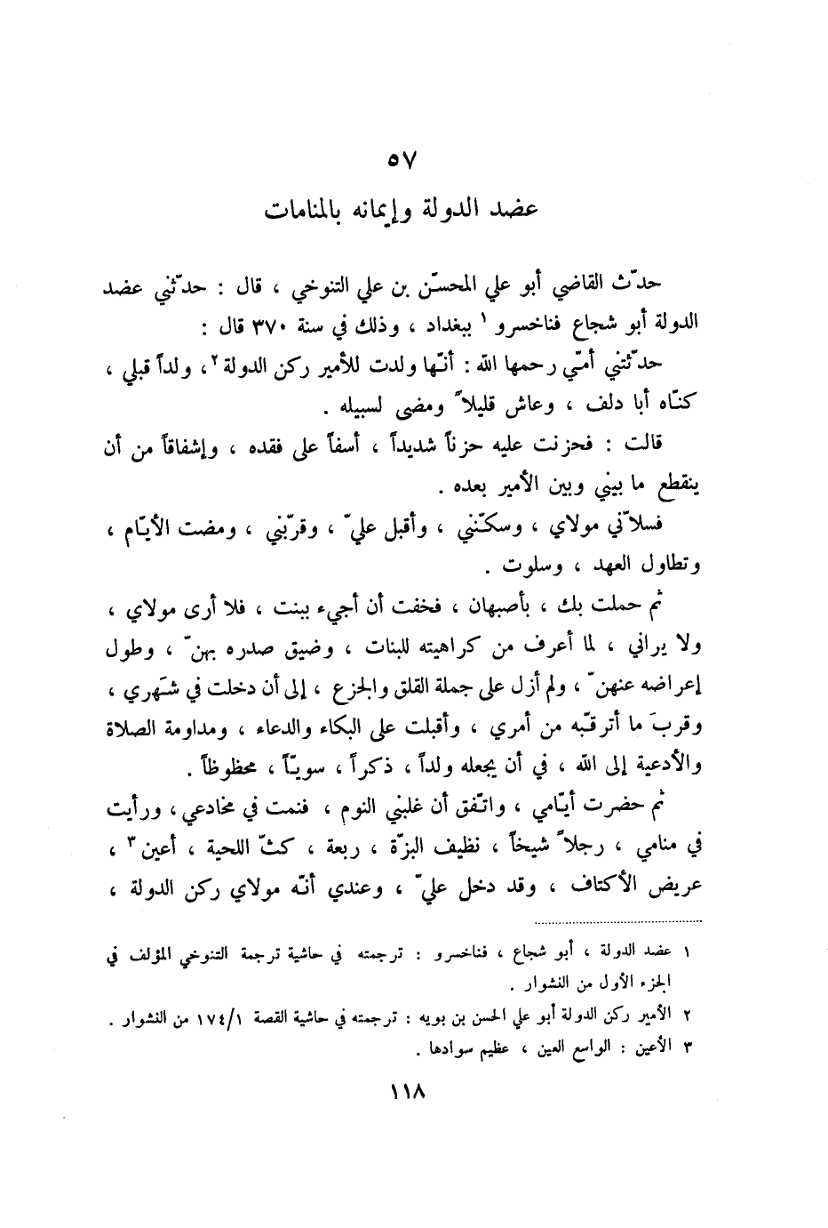 حدّث القاضي أبو علي المحسّن بن علي التنوخي، قال: حدّثني عضد الدولة أبو شجاع فناخسرو «1» ببغداد، وذلك في سنة 370 قال:
