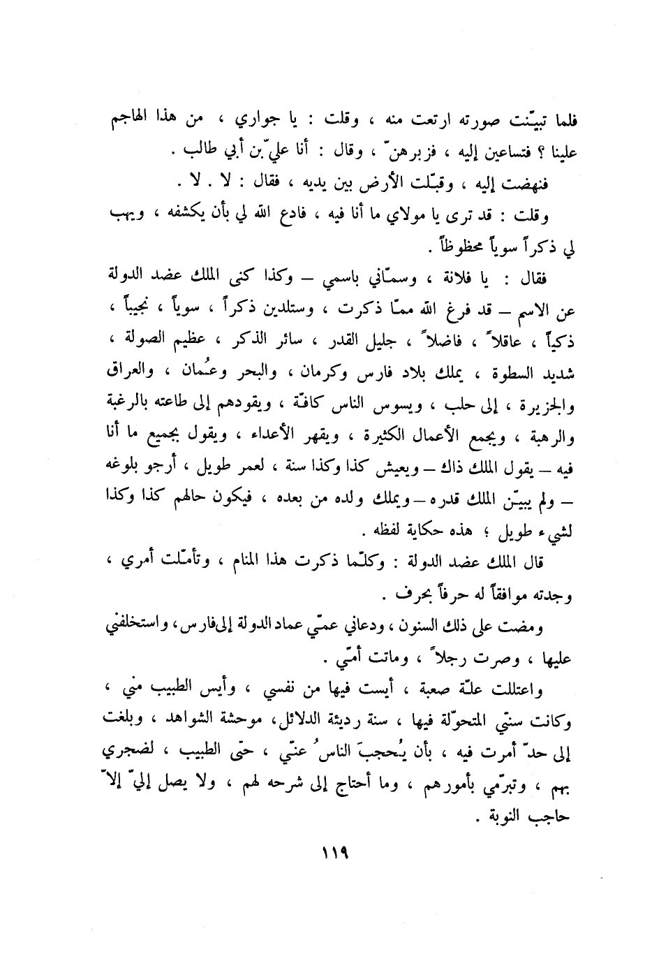 وقلت: قد ترى يا مولاي ما أنا فيه، فادع الله لي بأن يكشفه، ويهب لي ذكرا سويا محظوظا فقال: يا فلانة، وسمّاني باسمي- وكذا كنى الملك عضد الدولة عن الاسم- قد فرغ الله ممّا ذكرت، وستلدين ذكرا، سويا، نجيبا، ذكيا، عاقلا، فاضلا، جليل القدر، سائر الذكر، عظيم الصولة، شديد السطوة، يملك بلاد فارس وكرمان، والبحر وعمان، والعراق والجزيرة، إلى حلب، ويسوس الناس كافّة، ويقودهم إلى طاعته بالرغبة والرهبة، ويجمع الأعمال الكثيرة، ويقهر الأعداء، ويقول بجميع ما أنا فيه- يقول الملك ذاك- ويعيش كذا وكذا سنة، لعمر طويل، أرجو بلوغه- ولم يبيّن الملك قدره- ويملك ولده من بعده، فيكون حالهم كذا وكذا لشيء طويل، هذه حكاية لفظه.