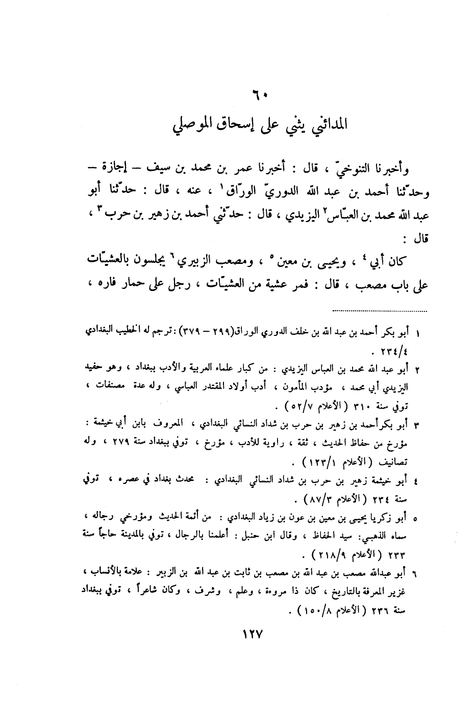 وأخبرنا التنوخي، قال: أخبرنا عمر بن محمد بن سيف- إجازة- وحدّثنا أحمد بن عبد الله الدوريّ الورّاق «1» ، عنه، قال: حدّثنا أبو عبد الله محمد بن العبّاس «2» اليزيدي، قال: حدّثني أحمد بن زهير بن حرب «3» ، قال: